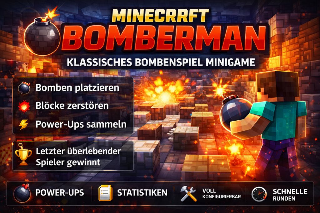 Das Bomberman Plugin bringt das klassische Bomberman Minigame direkt auf deinen Minecraft Server.